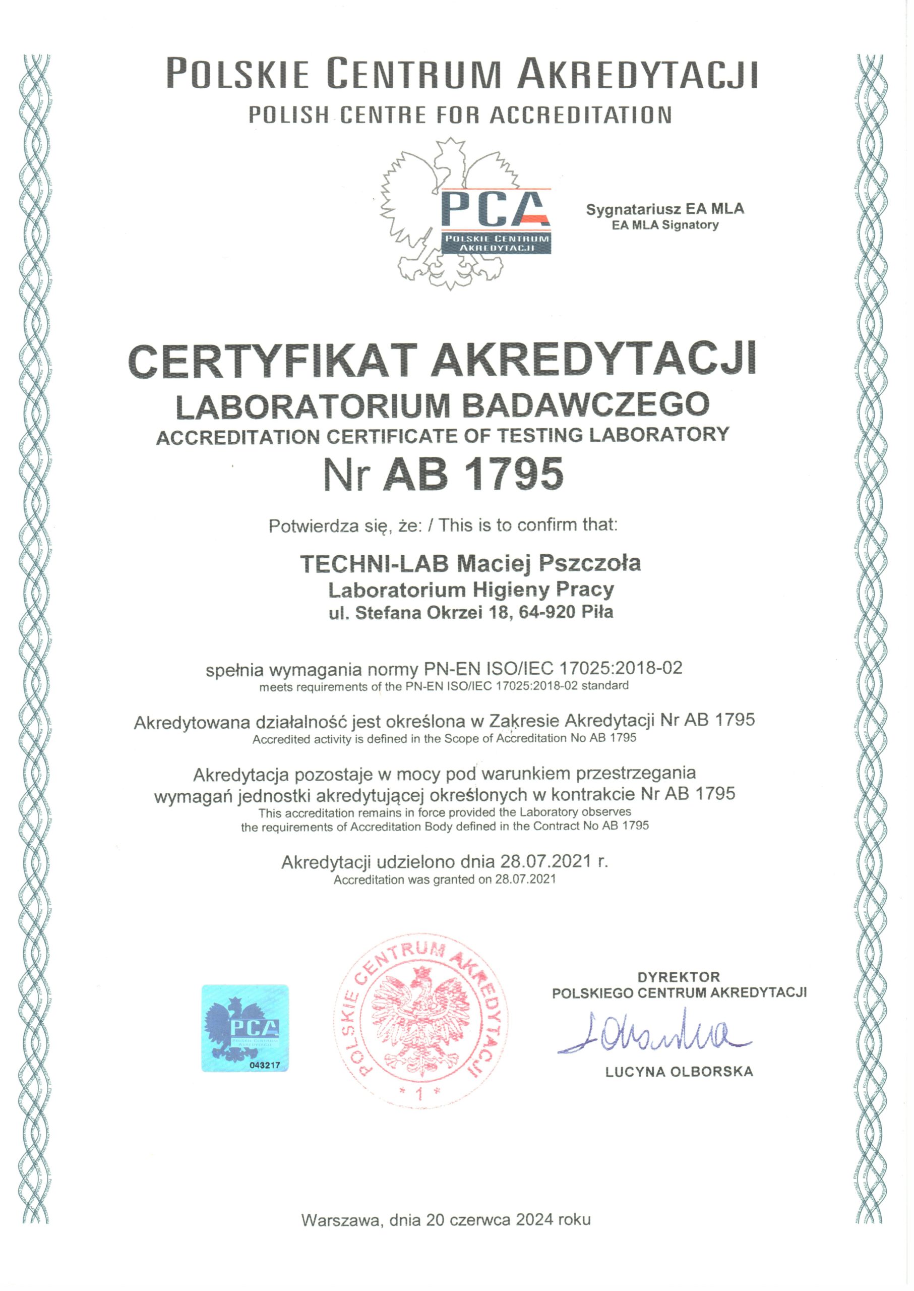 normy PN-EN ISO/IEC 17025:2018-02 jest certyfikat akredytacji nr AB 1795 wydany